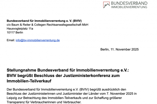 Berlin, 11. November 2025 – Der Bundesverband für Immobilienverrentung e.V. (BVIV) begrüßt ausdrücklich den Beschluss der Justizministerinnen und Justizminister der Länder vom 7. November 2025 in Leipzig zur Betrachtung des Immobilien-Teilverkaufs und zur Schaffung größerer Transparenz für Verbraucherinnen und Verbraucher.Zum Beschlussdokument der Justizministerkonferenz (TOP I.20) Dialog und Verantwortung für ein sicheres Marktumfeld Der BVIV hat […]
