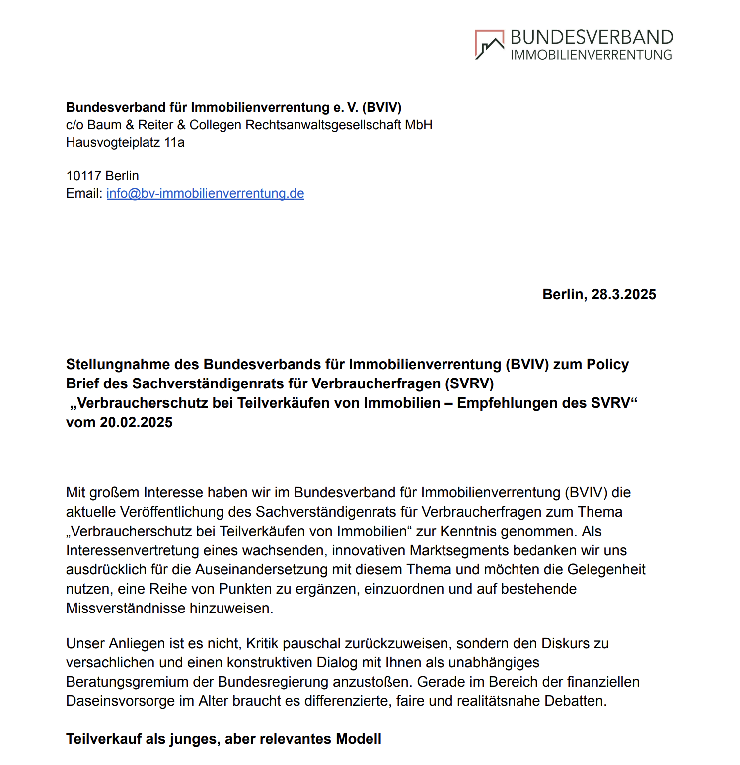 Berlin, 28.03.2025. Mit großem Interesse haben wir im Bundesverband für Immobilienverrentung (BVIV) die aktuelle Veröffentlichung des Sachverständigenrats für Verbraucherfragen zum Thema „Verbraucherschutz bei Teilverkäufen von Immobilien“ zur Kenntnis genommen. Als Interessenvertretung eines wachsenden, innovativen Marktsegments bedanken wir uns ausdrücklich für die Auseinandersetzung mit diesem Thema und möchten die Gelegenheit nutzen, eine Reihe von Punkten zu ergänzen, einzuordnen und auf bestehende Missverständnisse hinzuweisen.